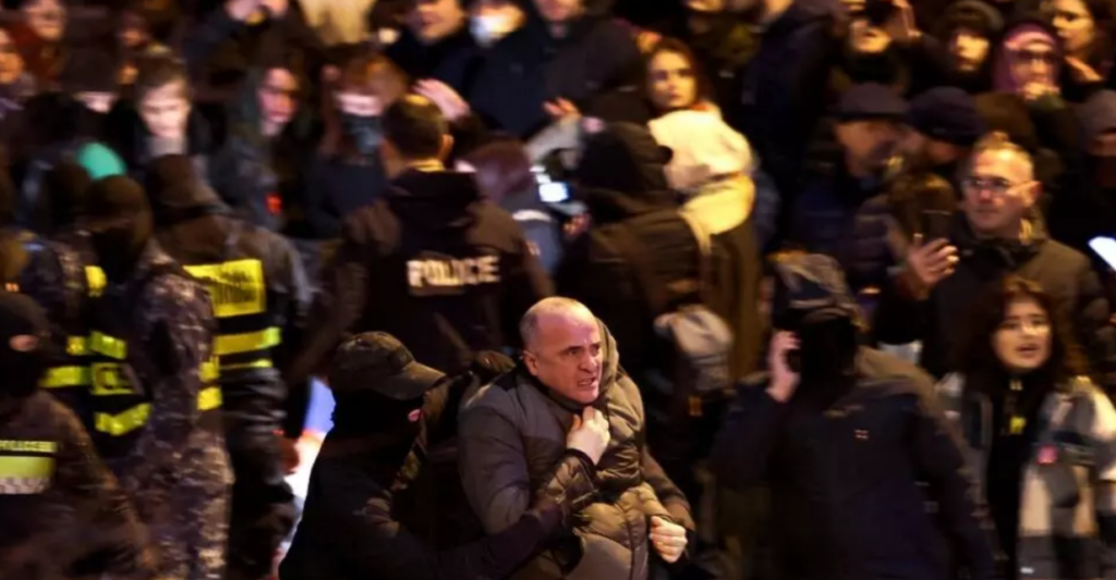 D’autres manifestants ont également été interpellés, et des images diffusées par la chaîne indépendante Pirveli montrent des policiers frappant brutalement certains d’entre eux. Zviad Kharazishvili, chef des opérations spéciales de la police de Tbilissi, déjà sanctionné par les États-Unis et le Royaume-Uni pour violations des droits humains, a été filmé en train de hurler des insultes aux protestataires.